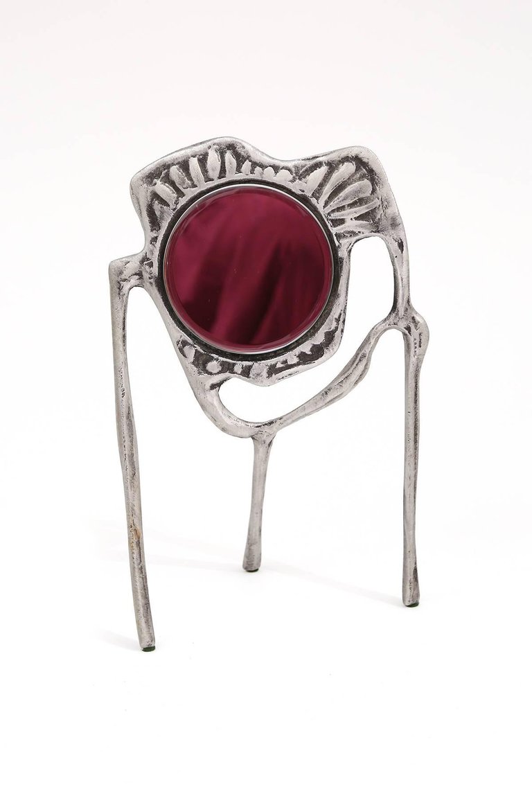Donald Drumm aluminum table top mirror circa early 1970’s. This sculptural example has three legs organic patterning and is signed on the back.