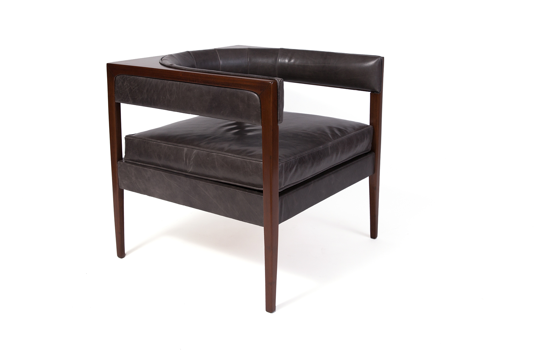 John Van Koert leather and walnut lounge chairs, circa early 1960s. These sculptural examples have newly finished walnut frames and have been newly upholstered in a beautifully patinated charcoal leather. Price listed is for the pair.