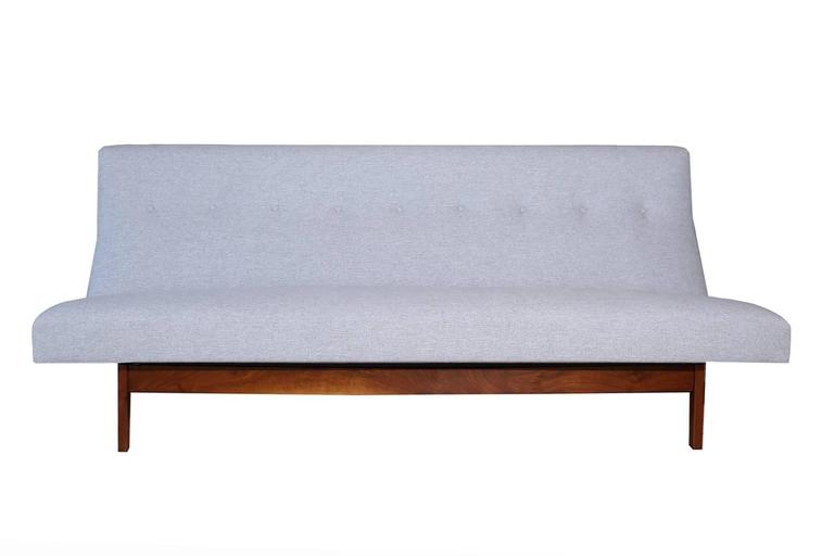 Rare sectional sofa by Jens Risom, circa late 1950s. This custom ordered exceptional example has newly sanded and oiled solid walnut bases, stretchers and backs and has been newly upholstered in a stunning and supple grey textile. This can be used as shown or separated into three separate pieces. Sofa measures 160″ corner to corner and each of the large sofas measure 78″ long.