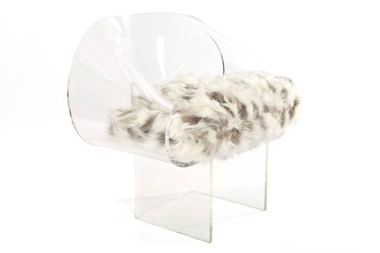 Robert Van Horn Lucite ribbon chair and ottoman, circa late 1970s. This signed all original example is 0.75” thick and has its original faux fur upholstery. Ottoman measures: 16″ tall x 12.5″ deep x 16″ wide.